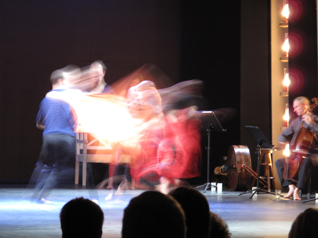 Here words, music, noises, and dance form a symbiosis that overcomes all borders of the arts. Musicians and singer become an integral part of the choreography, dancers start playing instruments, and all performers let their vocal cords sound.